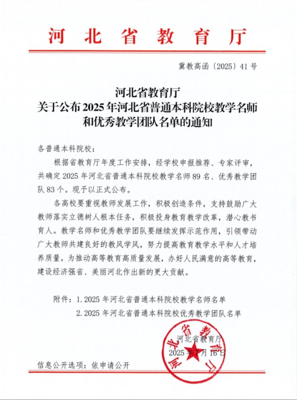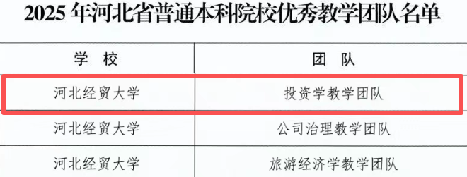 近日,河北省教育厅下发《关于公布2025年河北省普通本科院校教学名师和优秀教学团队名单的通知》(冀高教函〔2025〕41号)文件,经学院推荐、学校专家评审推荐和省教育厅评选,成人影片 投资学教学团队凭借扎实的教学实力、鲜明的教学特色及突出的育人成效,成功入选2025年河北省普通本科院校优秀教学团队。