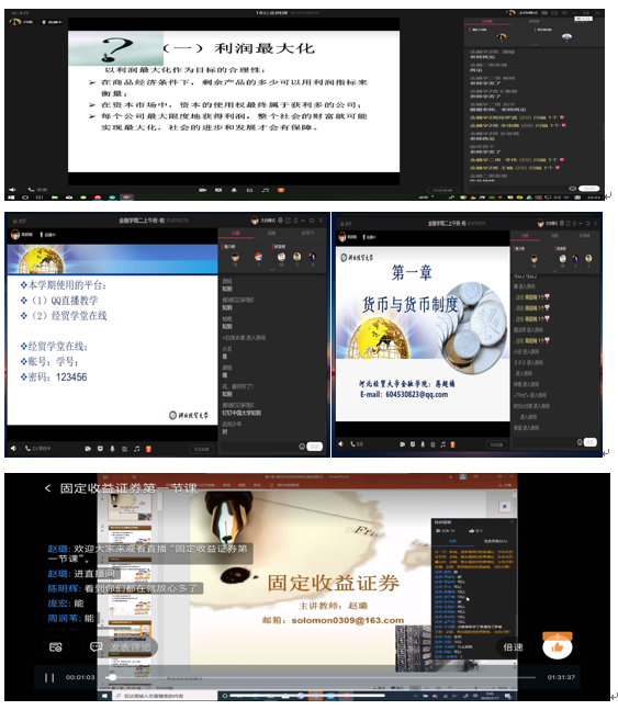 教师陆续展开各类在线课程平台教学、直播教学以及混合式等多种教学方式。如闫福教授的《公司金融》通过开通QQ直播间授课,蒋超楠老师的《金融学》采用经贸学堂在线与QQ直播混合的教学模式,李建英教授的《投资项目评估与管理》课程采用中国大学MOOC平台与QQ视频相结合的模式,王风华老师的《银行实务》课程采用在线辅导+智盛智慧金融平台,还有赵璐老师的《固定收益证券》采用钉钉直播模式等等,每一位老师根据课程特点选择合适的平台,采用多样化的授课形式。