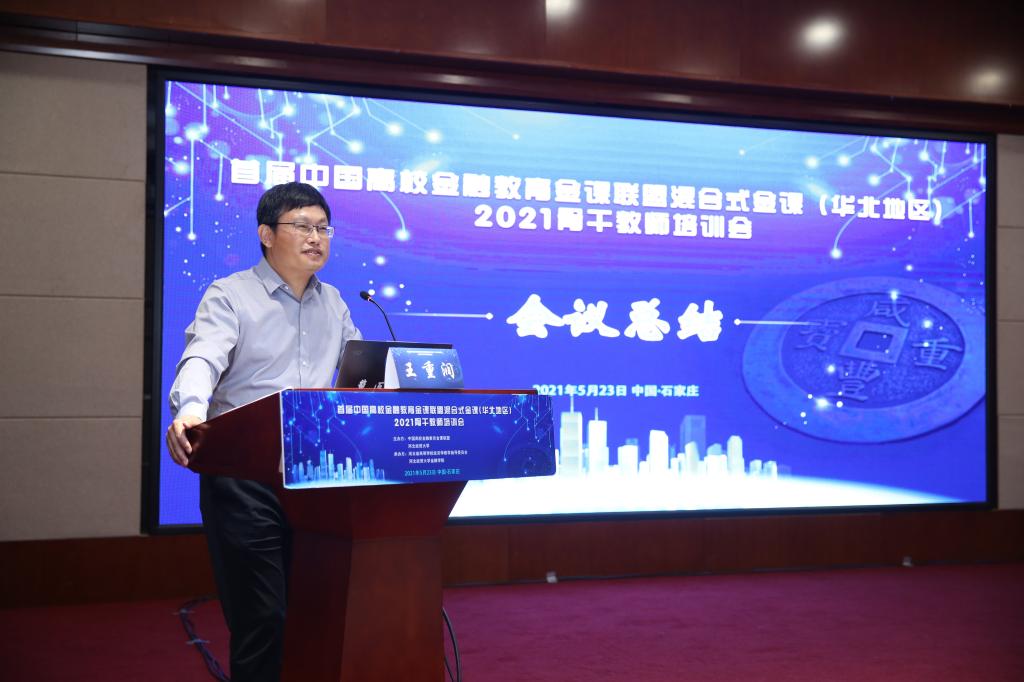 王重润教授作总结发言,祝贺首届中国高校金融教育金课联盟混合式金课(华北地区)骨干教师培训会取得圆满成功,感谢与会专家的精彩报告和各高校参会代表对大会的支持及对会务组工作的高度认可。他说,这次大会展示了国家级一流本科课程建设成果,促进了教学理念和教学经验交流,对提升金融学专业课程建设水平、推动新财经教育教学改革发挥了积极作用。