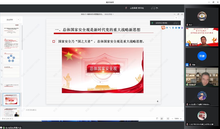 此后,会议进入主要内容,由陈向阳主任向大家详细介绍国家安全及总体国家安全观的内涵、总体国家安全观的发展脉络、国家安全面临的现实挑战和战略部署等内容。在此基础上,围绕其“五大要素”详细阐述了总体国家安全观是逻辑严密、思想深刻的系统论,从“五大关系”到“五个统筹”是总体国家安全观科学辩证、与时俱进的方法论,指出习近平总书记关于总体国家安全观的系列论述是习近平新时代中国特色社会主义思想的重要组成部分。