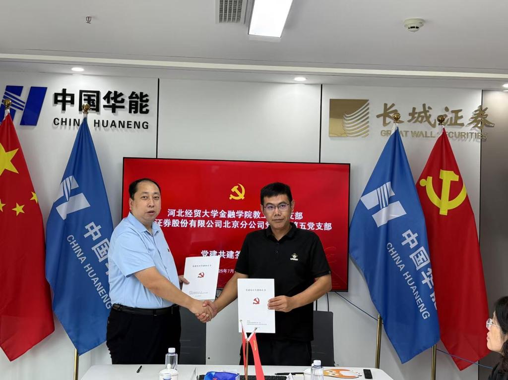 窦丽琛与闫红亮签署实践教学基地建设协议书。李艳辉与长城证券北京分公司党总支第五党支部代表车凯磊签署党建结对共建协议书。