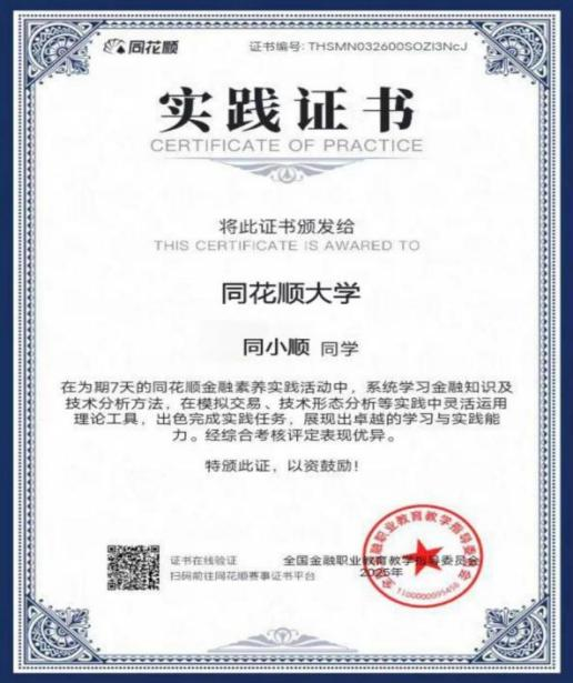 全程参与教学并完成实践任务,总分85分以上同学将获得由教育部职业金融教指委颁发的证书1份,以及由兴业证券颁发的证书1份。