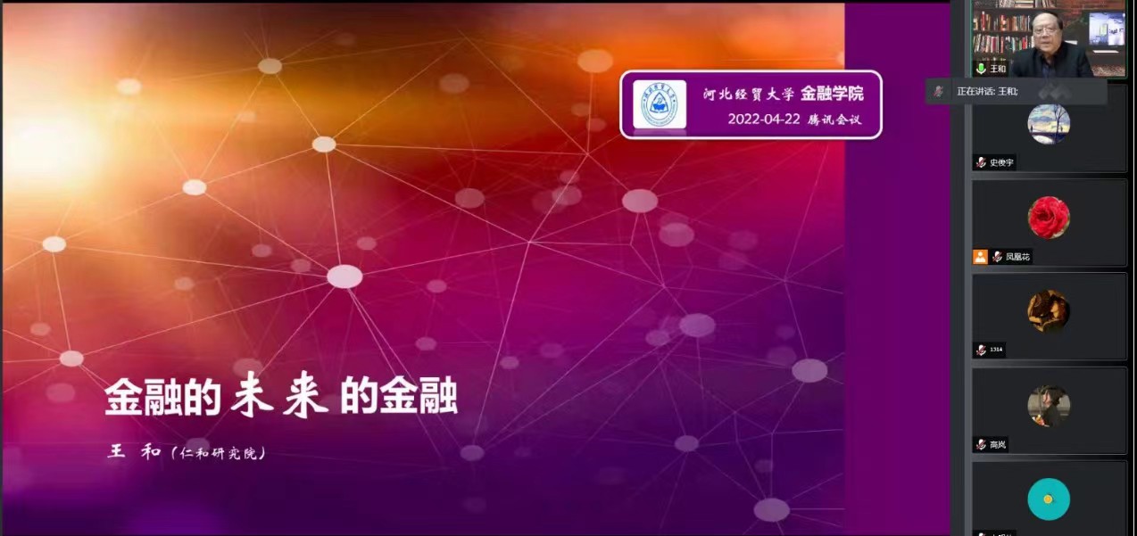 主办的主题为“金融的未来与未来的金融”学术报告顺利开展,活动以腾讯会议的方式线上举行。中国精算师协会会长、保险界知名高管型学者王和会长应邀主讲,报告由冯文丽老师主持,近150名师生参加。